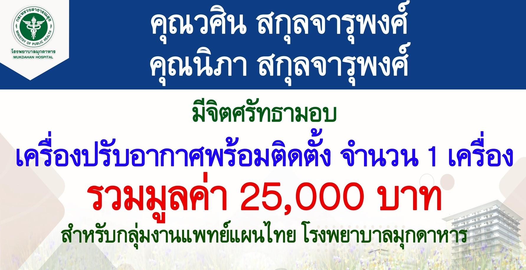 มีจิตศรัทธามอบเครื่องปรับอากาศพร้อมติดตั้ง จำนวน 1 เครื่อง รวมมูลค่า 25,000 บาท