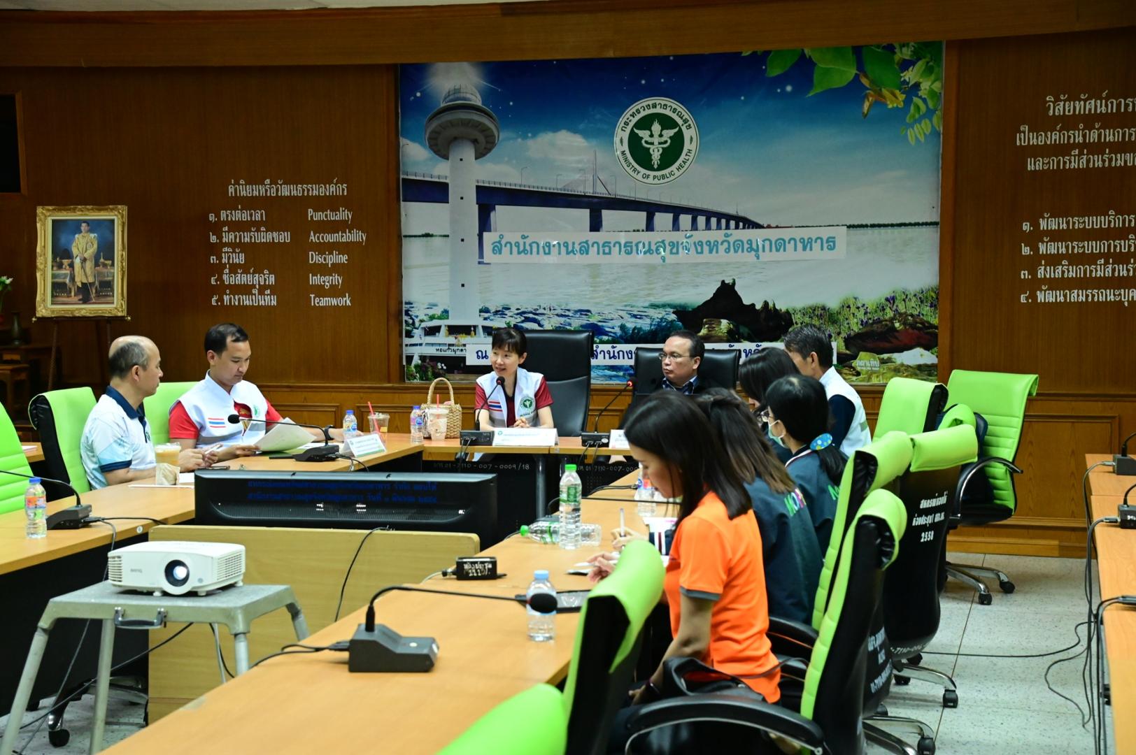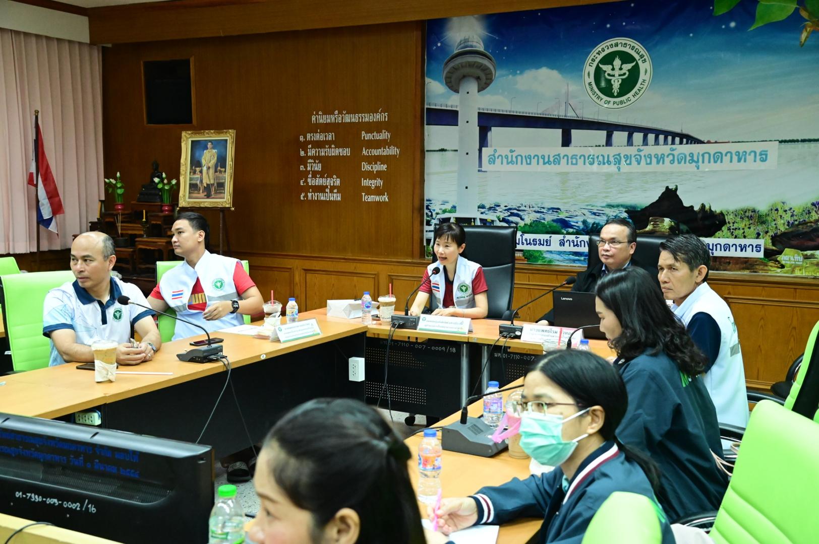 แพทย์หญิงกันตินันท์ มหาสุวีระชัย ผู้อำนวยการโรงพยาบาลมุกดาหาร พร้อมด้วยคณะผู้บริหาร และบุคลากรในสังกัดกระทรวงสาธารณสุข ร่วมต้อนรับนายแพทย์โรม บัวทอง ผู้อำนวยการกองด่านควบคุมโรคติดต่อระหว่างประเทศและกักกันโรค พร้อมคณะ ในการลงพื้นที่ จ.มุกดาหาร เพื่อหารือและสรุปผลการสอบสวน กรณีผู้ป่วยยืนยันโรคแอนแทรกซ์ จังหวัดมุกดาหารและให้แนวทางในการดำเนินงาน การค้นหา เฝ้าระวังในโรงพยาบาล และพื้นที่ในจังหวัดมุกดาหาร