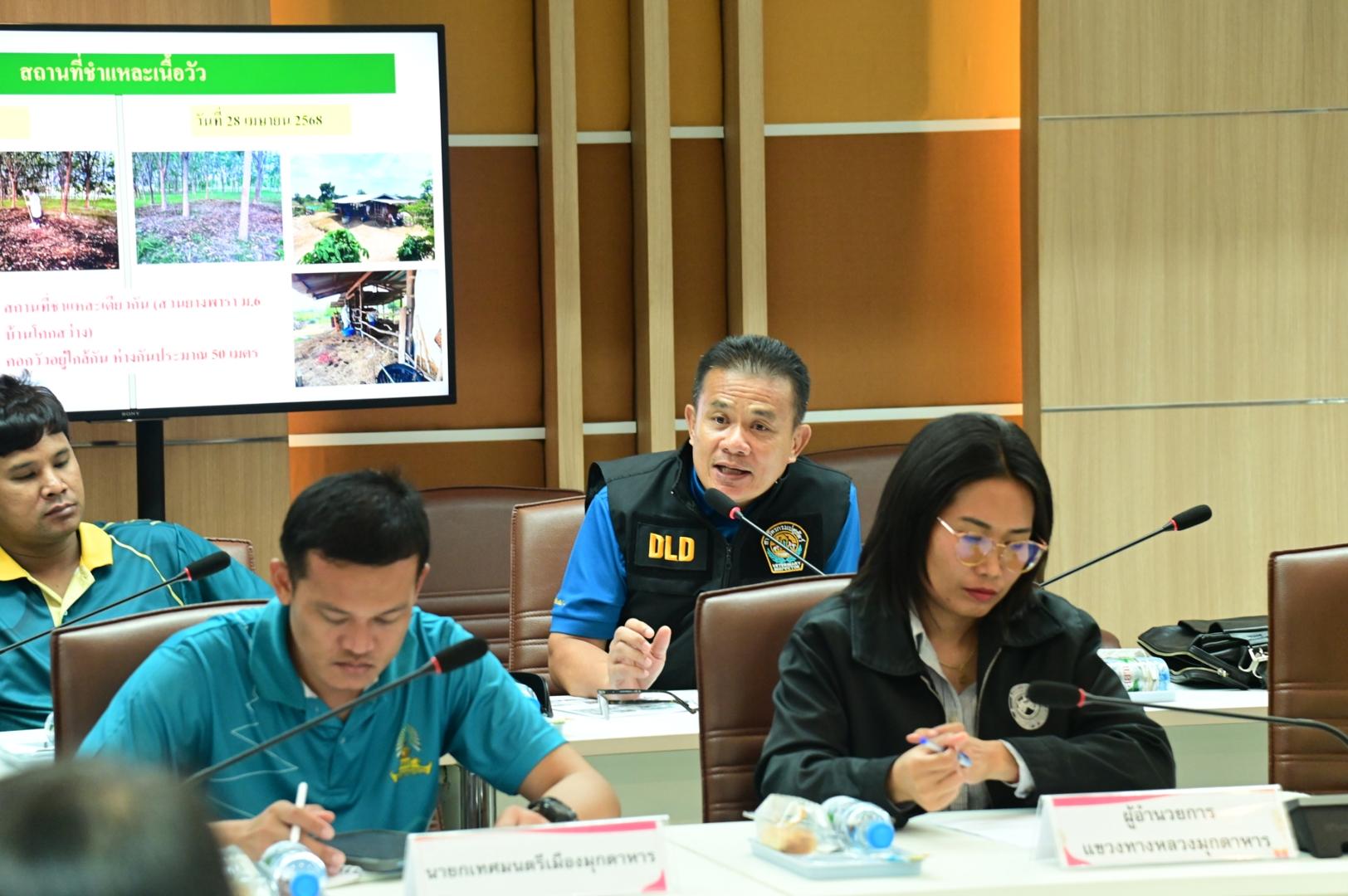 แพทย์หญิงกันตินันท์ มหาสุวีระชัย ผู้อำนวยการโรงพยาบาลมุกดาหาร พร้อมด้วยคณะผู้บริหารและบุคลากรในสังกัดกระทรวงสาธารณสุข เข้าร่วมประชุมคณะกรรมการโรคติดต่อจังหวัดมุกดาหาร และส่วนราชการที่เกี่ยวข้อง ครั้งที่ 2/2568 จากสถานการณ์ พบผู้ป่วยยืนยันโรค แอนแทรกซ์ จำนวน 4 ราย เสียชีวิต 1 ราย ในพื้นที่จังหวัดมุกดาหาร เพื่อติดตามสถานการณ์ และกำหนดมาตรฐานการเฝ้าระวัง ป้องกันและสอบสวนควบคุมโรค และภัยสุขภาพทางสาธารณสุข ทั้งในภาวะปกติและภาวะฉุกเฉิน ให้สามารถดำเนินการได้อย่างรวดเร็ว ทันเหตุการณ์สามารถหยุดยั้งไม่ให้มีการแพร่ระบาดของโรคได้อย่างมีประสิทธิภาพ