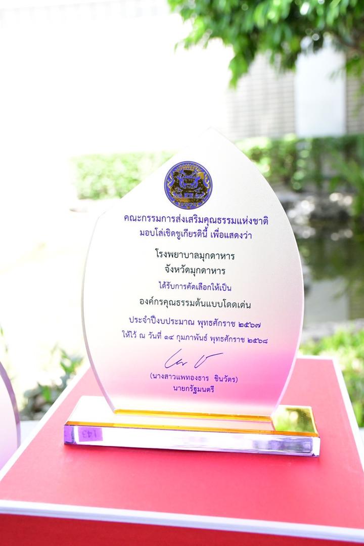ในการนี้ โรงพยาบาลมุกดาหารได้รับโล่รางวัลเชิดชูเกียรติองค์กรคุณธรรมต้นแบบโดดเด่น ประจำปีงบประมาณ พ.ศ.2567