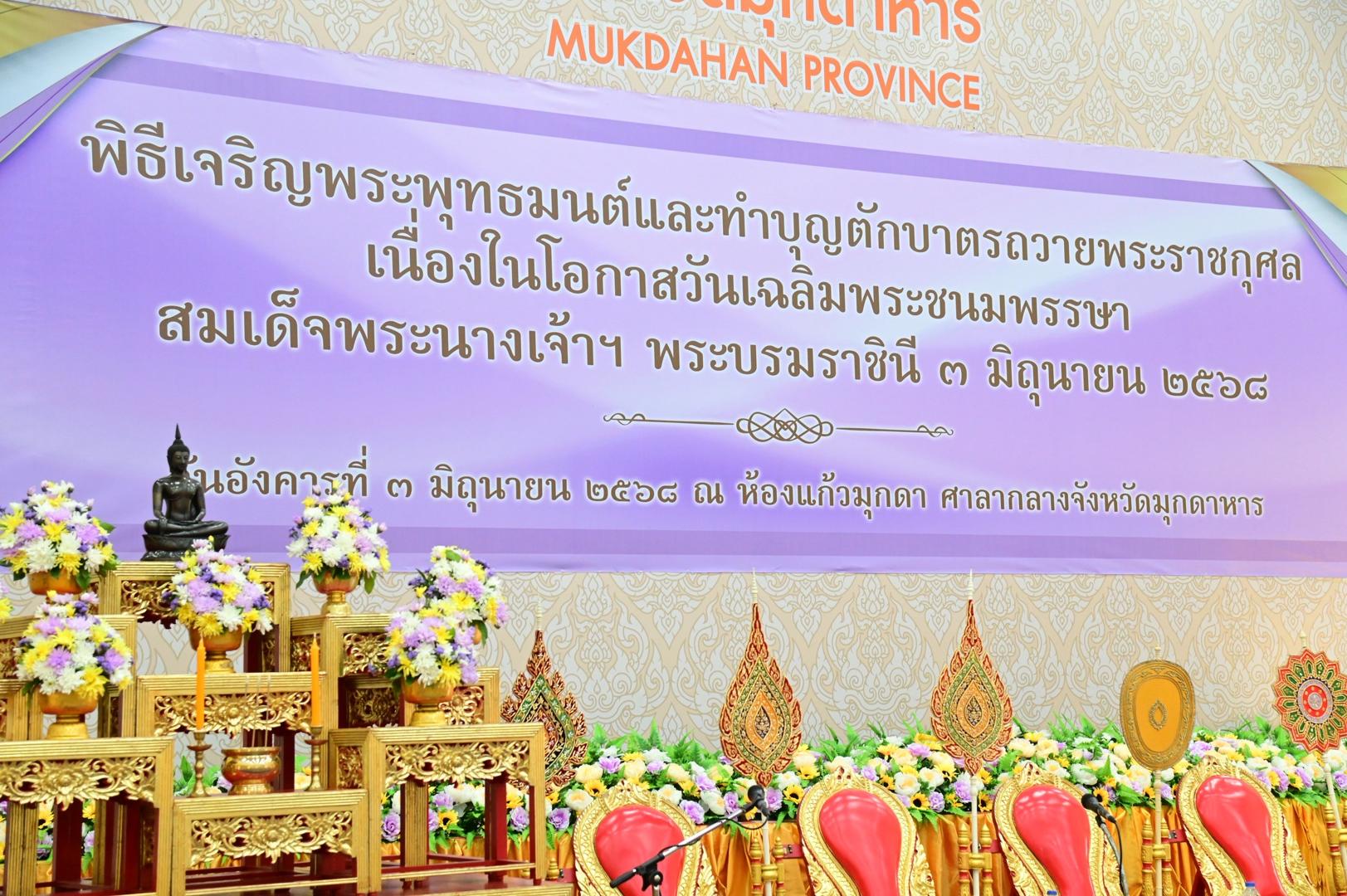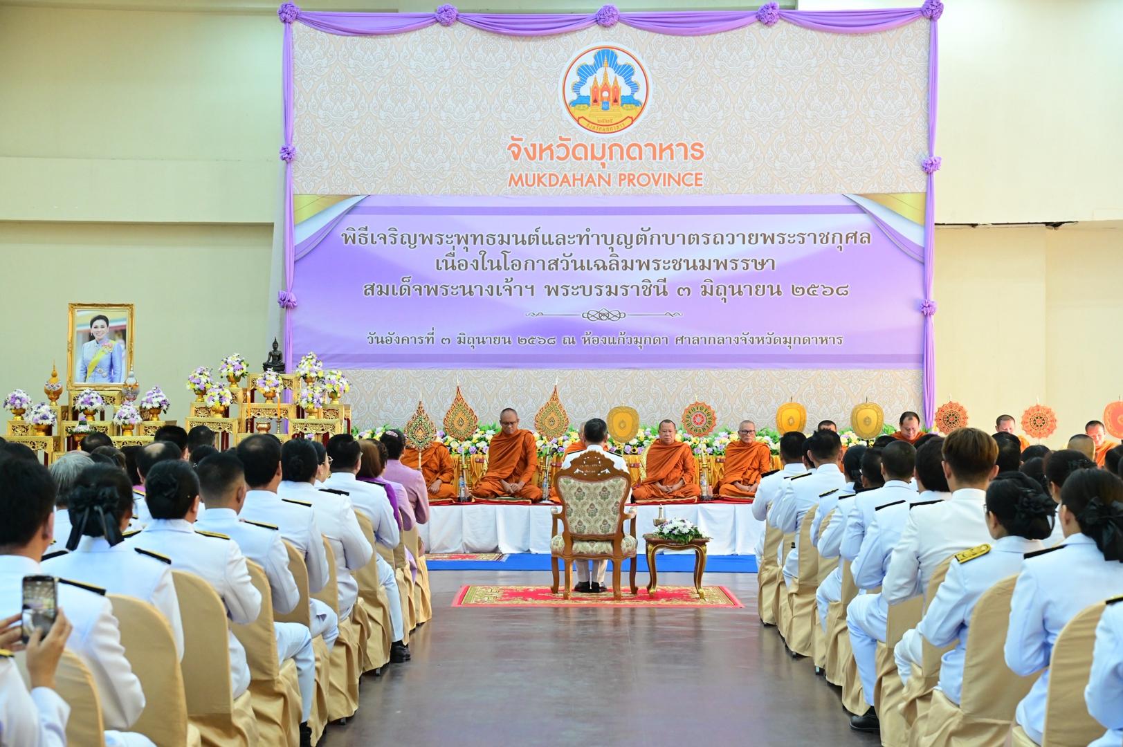 แพทย์หญิงกันตินันท์ มหาสุวีระชัย ผู้อำนวยการโรงพยาบาลมุกดาหาร มอบหมายให้นายแพทย์นารท เจนประวิทย์ ผู้ช่วยผู้อำนวยงานด้านปฐมภูมิและเครือข่าย พร้อมด้วยเจ้าหน้าที่โรงพยาบาลมุกดาหาร ร่วมพิธีเจริญพระพุทธมนต์ และทำบุญตักบาตรพระสงฆ์ 58 รูป ถวายพระราชกุศล เนื่องในโอกาสวันเฉลิมพระชนมพรรษา สมเด็จพระนางเจ้าฯ พระบรมราชินี 3 มิถุนายน 2568 เพื่อเป็นการถวายความจงรักภักดีและสำนึกในพระมหากรุณาธิคุณ อีกทั้งยังเป็นการปลูกจิตสำนึกให้กับประชาชนในการรักษาขนบธรรมเนียมประเพณีอันงดงามให้คงอยู่ต่อไป