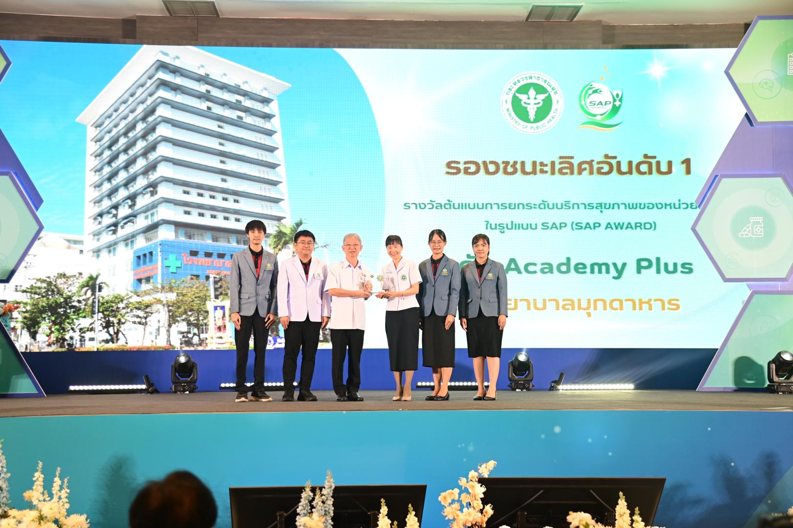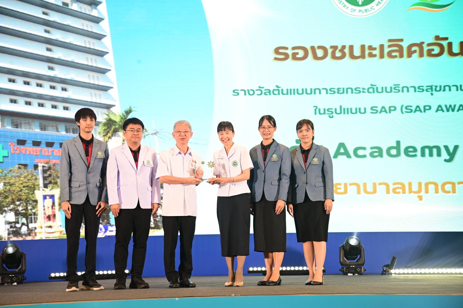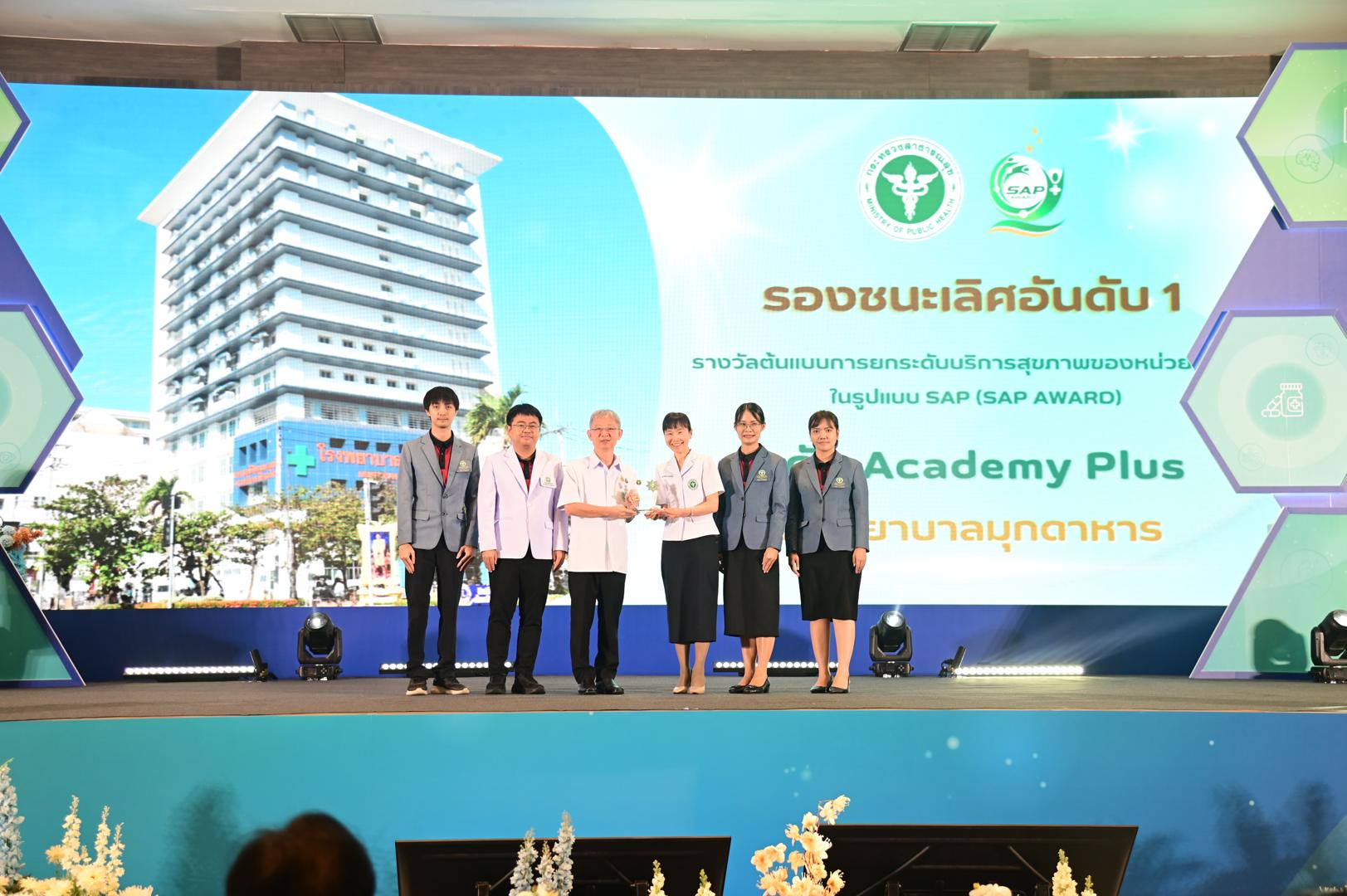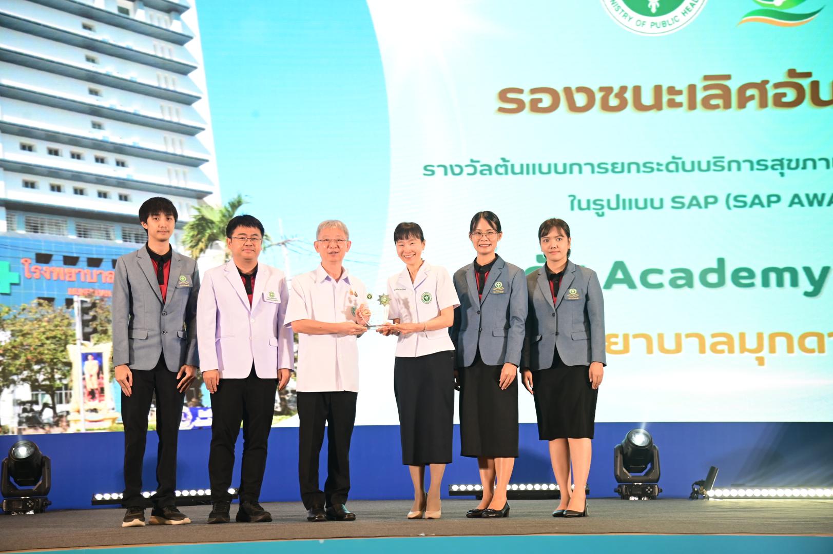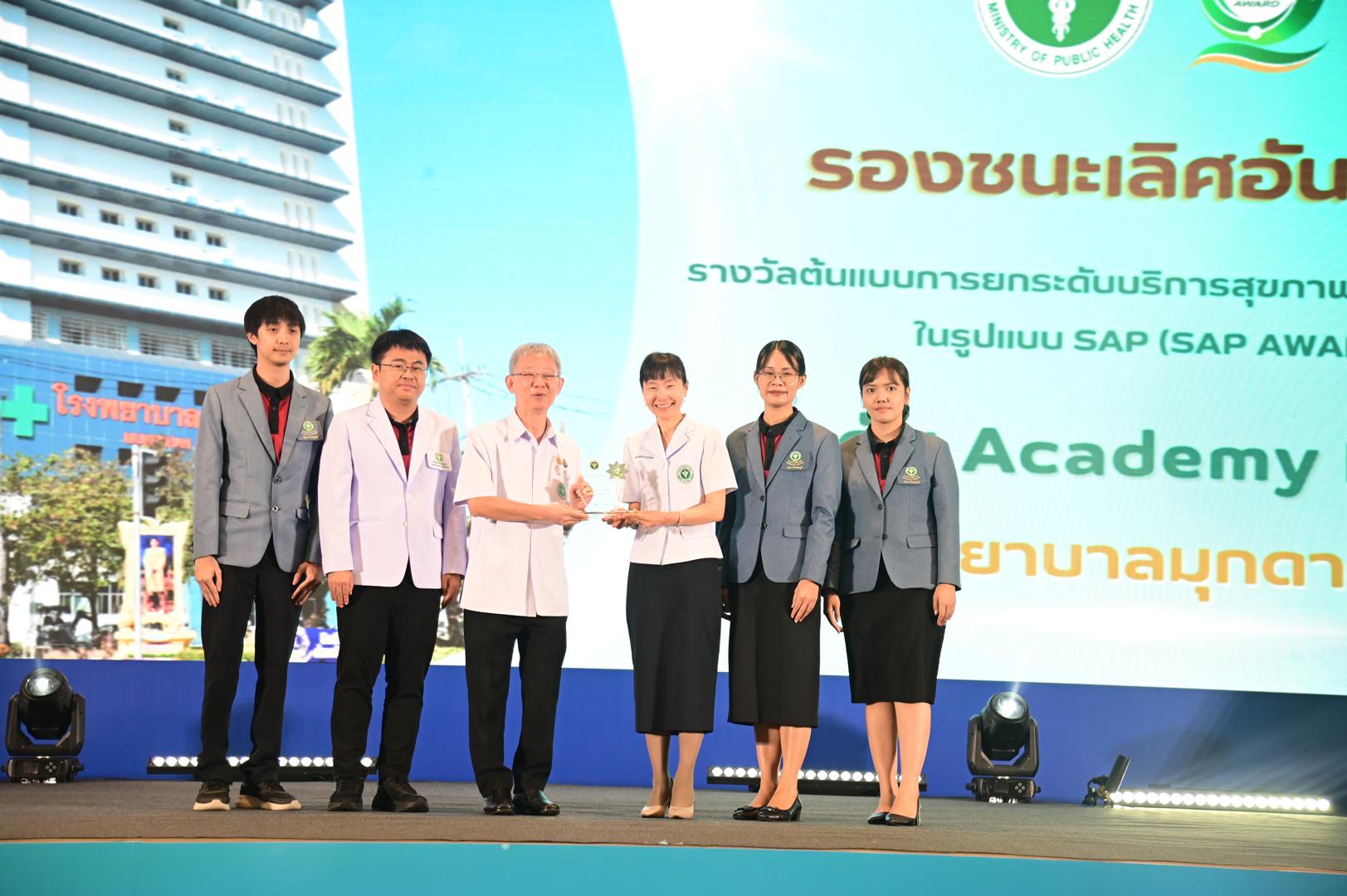 ในโอกาสนี้ โรงพยาบาลมุกดาหารได้รับ โล่รางวัลพร้อมใบประกาศเกียรติคุณ รองชนะเลิศ อันดับ 1 ต้นแบบการยกระดับบริการสุขภาพของหน่วยบริการในรูปแบบ SAP (SAP AWARD) ปี 2568 ”ระดับ Academy Plus“