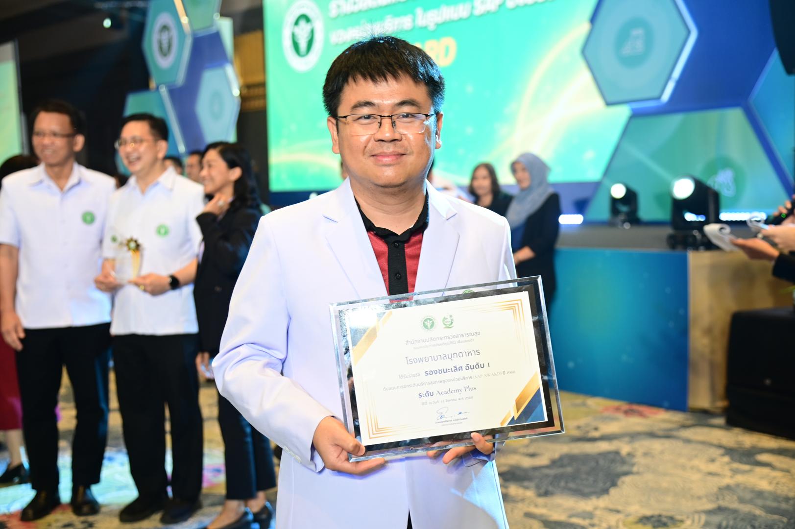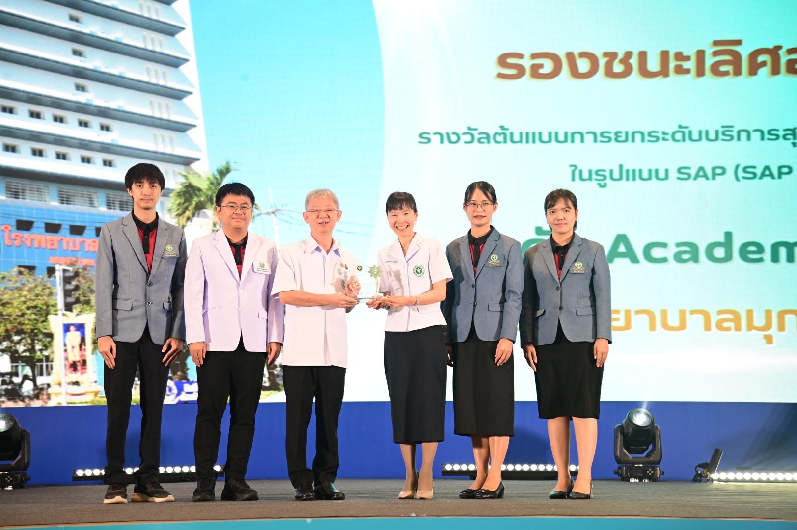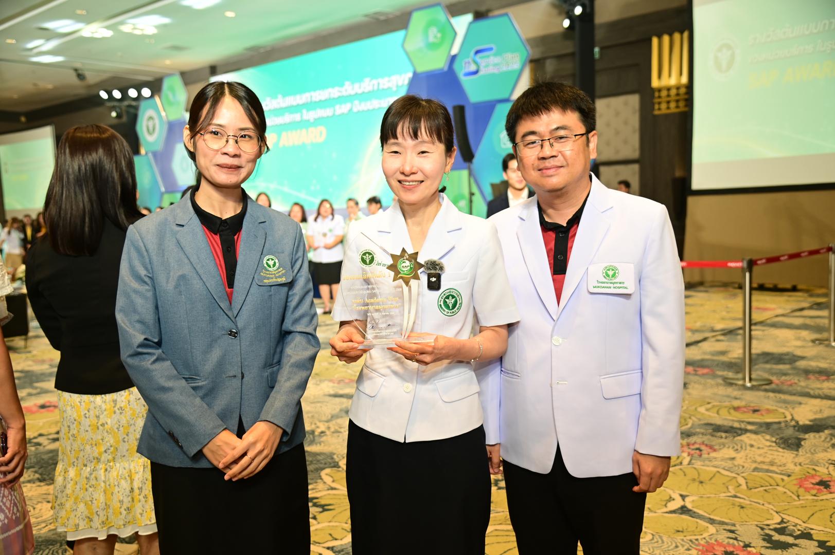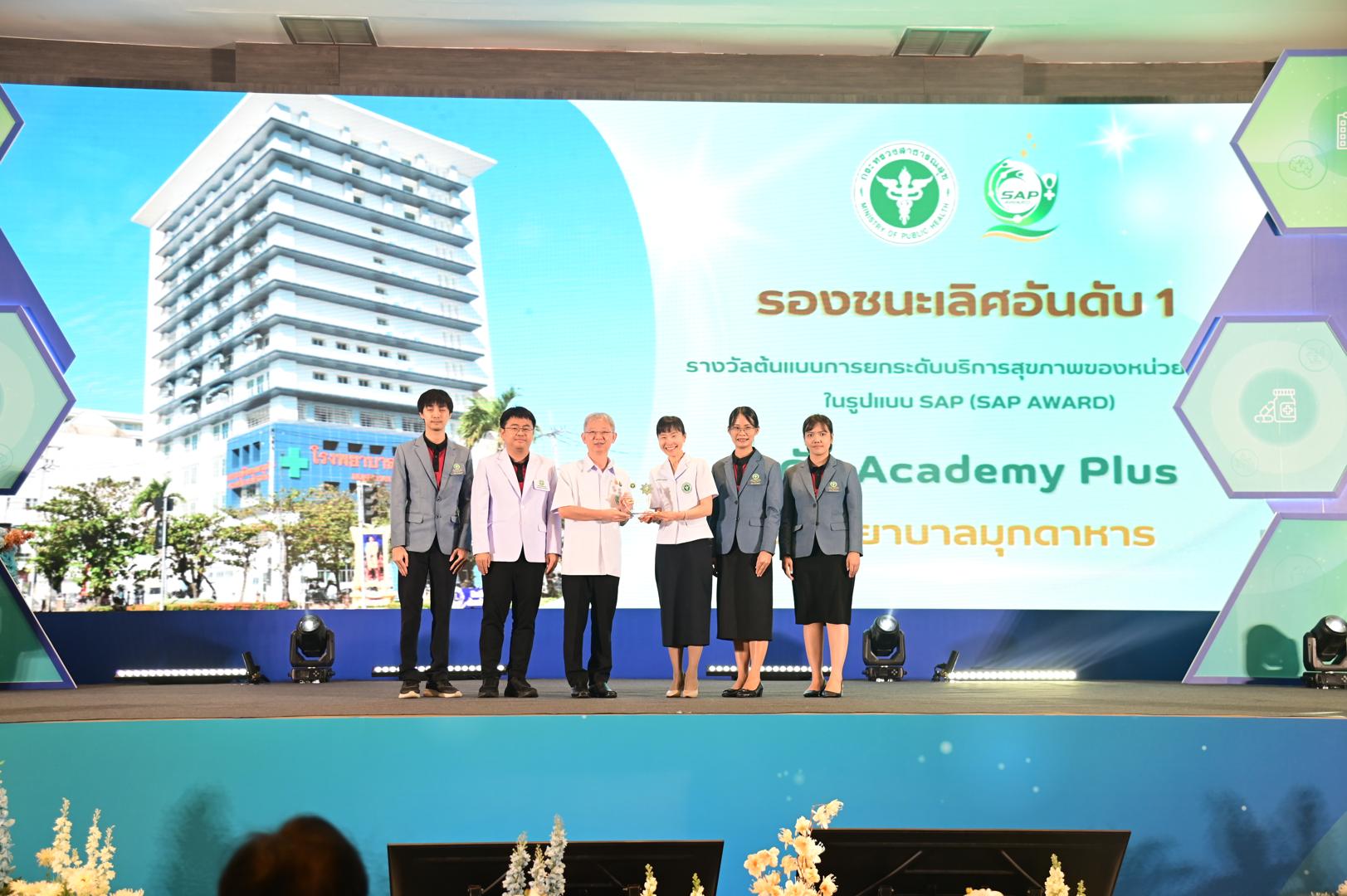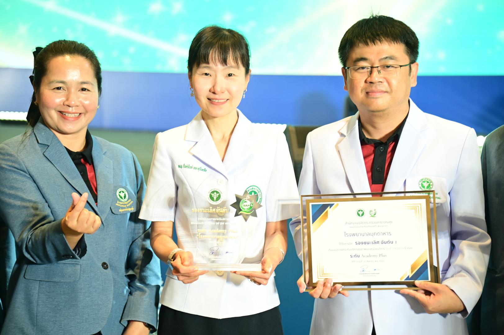 ในโอกาสนี้ โรงพยาบาลมุกดาหารได้รับ โล่รางวัลพร้อมใบประกาศเกียรติคุณ รองชนะเลิศ อันดับ 1 ต้นแบบการยกระดับบริการสุขภาพของหน่วยบริการในรูปแบบ SAP (SAP AWARD) ปี 2568 ”ระดับ Academy Plus“