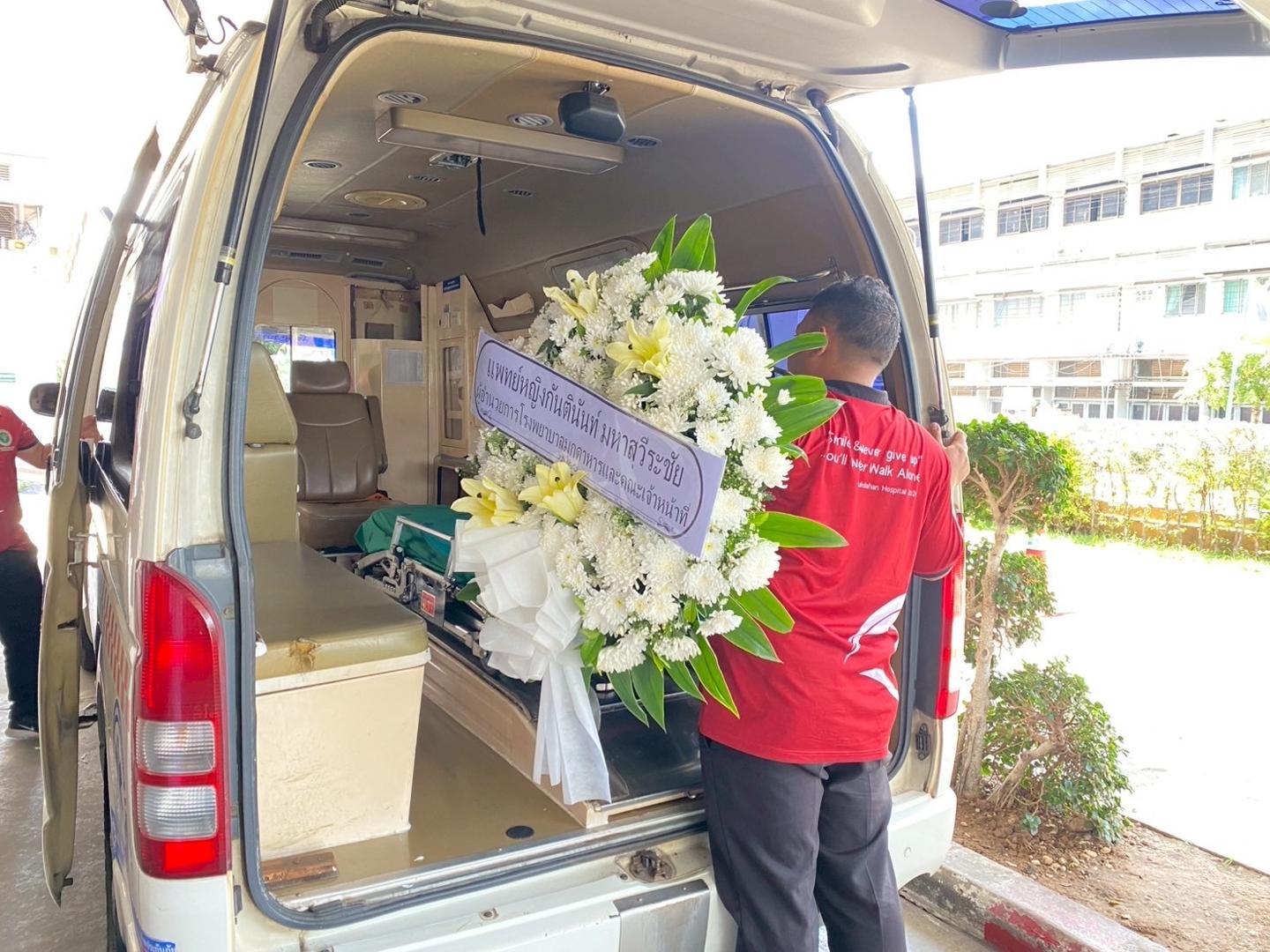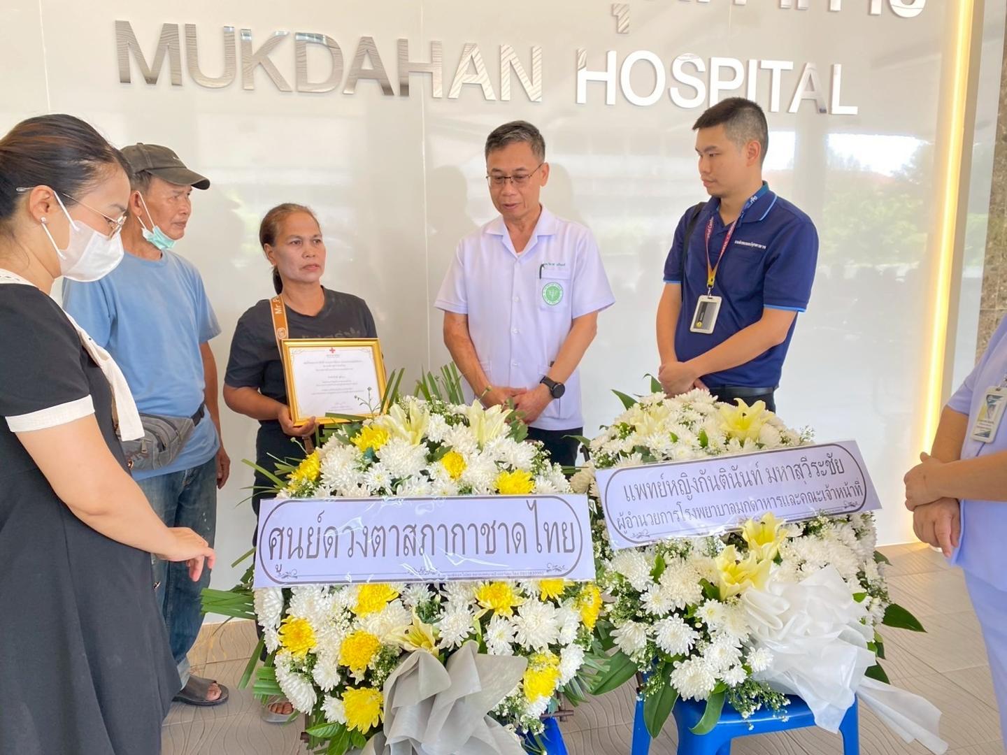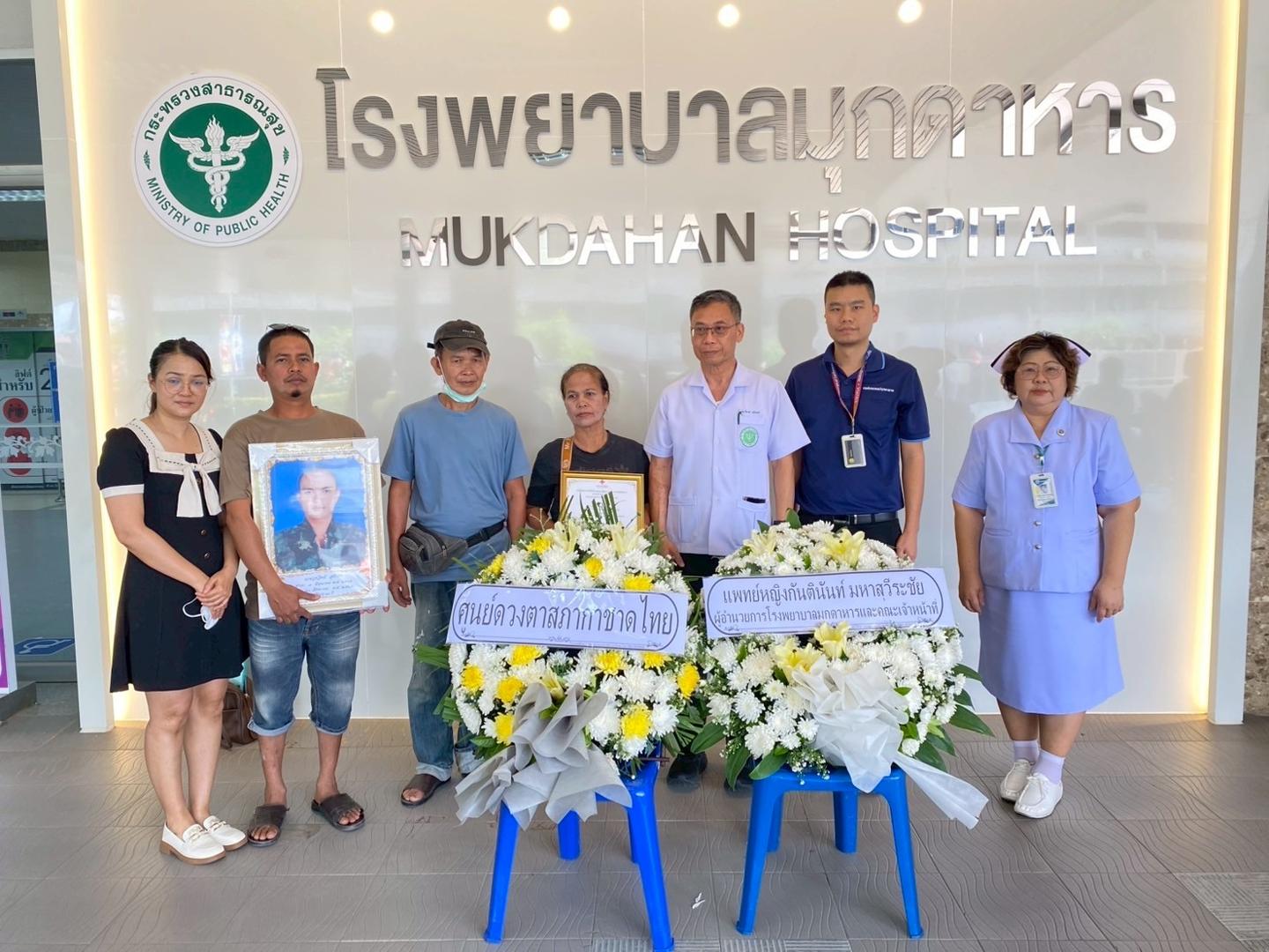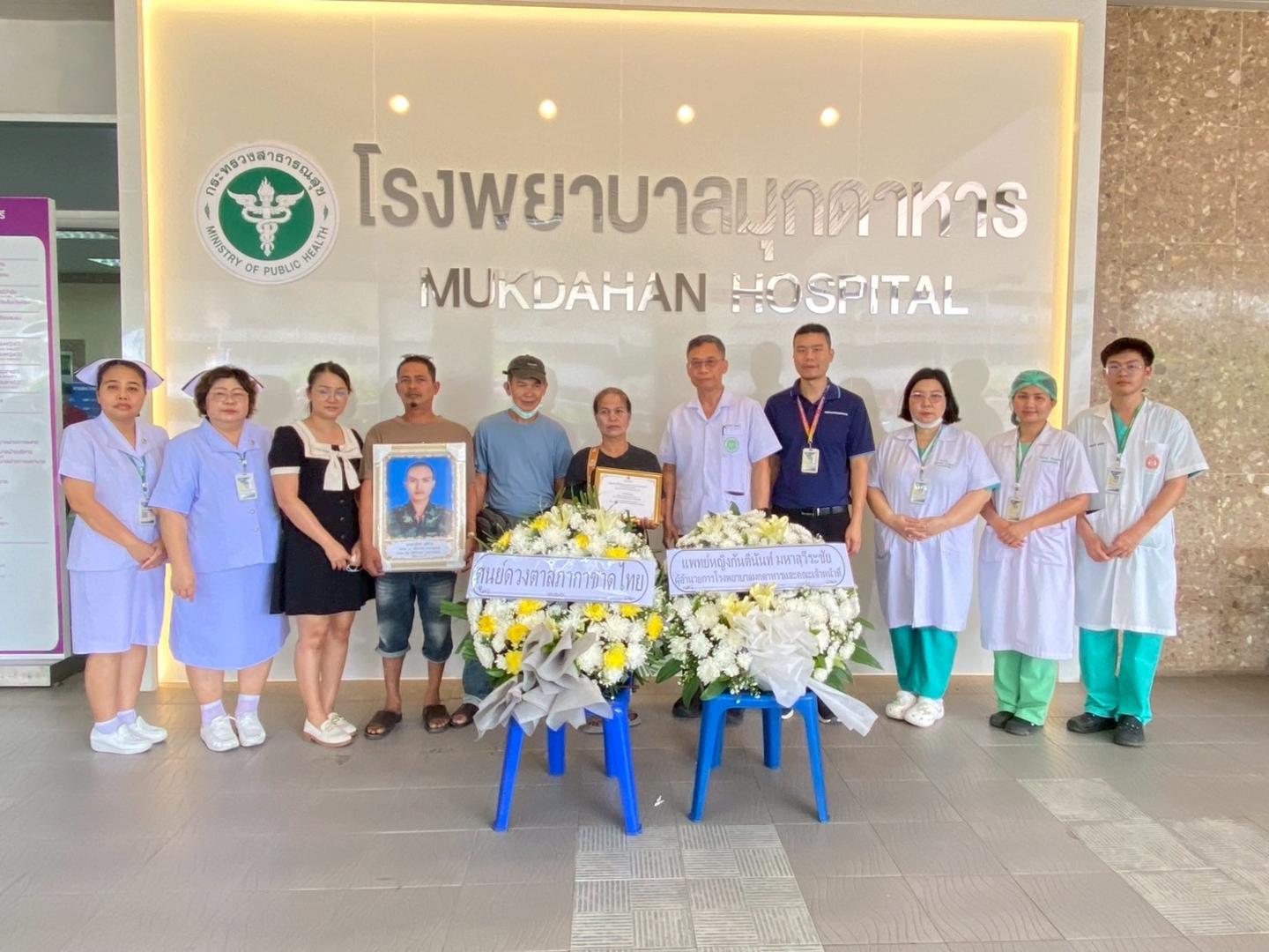 แพทย์หญิงกันตินันท์ มหาสุวีระชัย ผู้อำนวยการโรงพยาบาลมุกดาหาร มอบหมายให้นายแพทย์วิลาศ นรินทร์ รองผู้อำนวยการฝ่ายการแพทย์ พร้อมด้วยคณะแพทย์ พยาบาล และบุคลากรศูนย์รับบริจาคอวัยวะโรงพยาบาลมุกดาหาร ร่วมกับเหล่ากาชาดจังหวัดมุกดาหาร