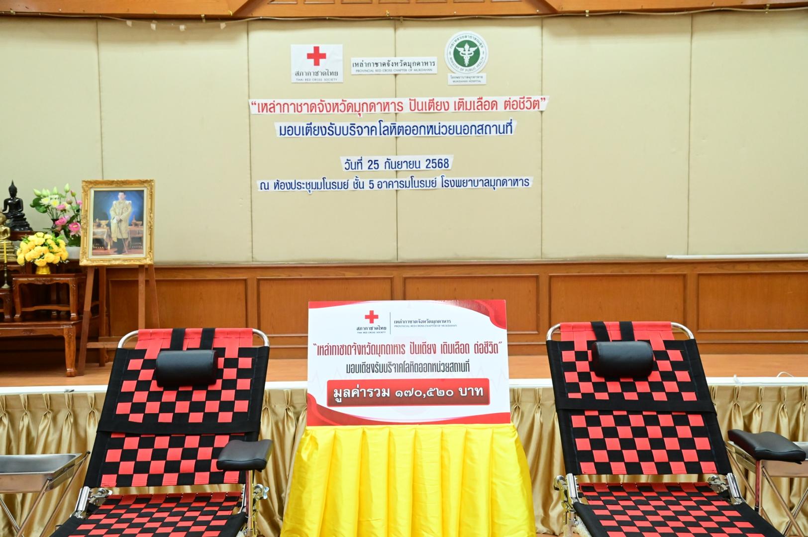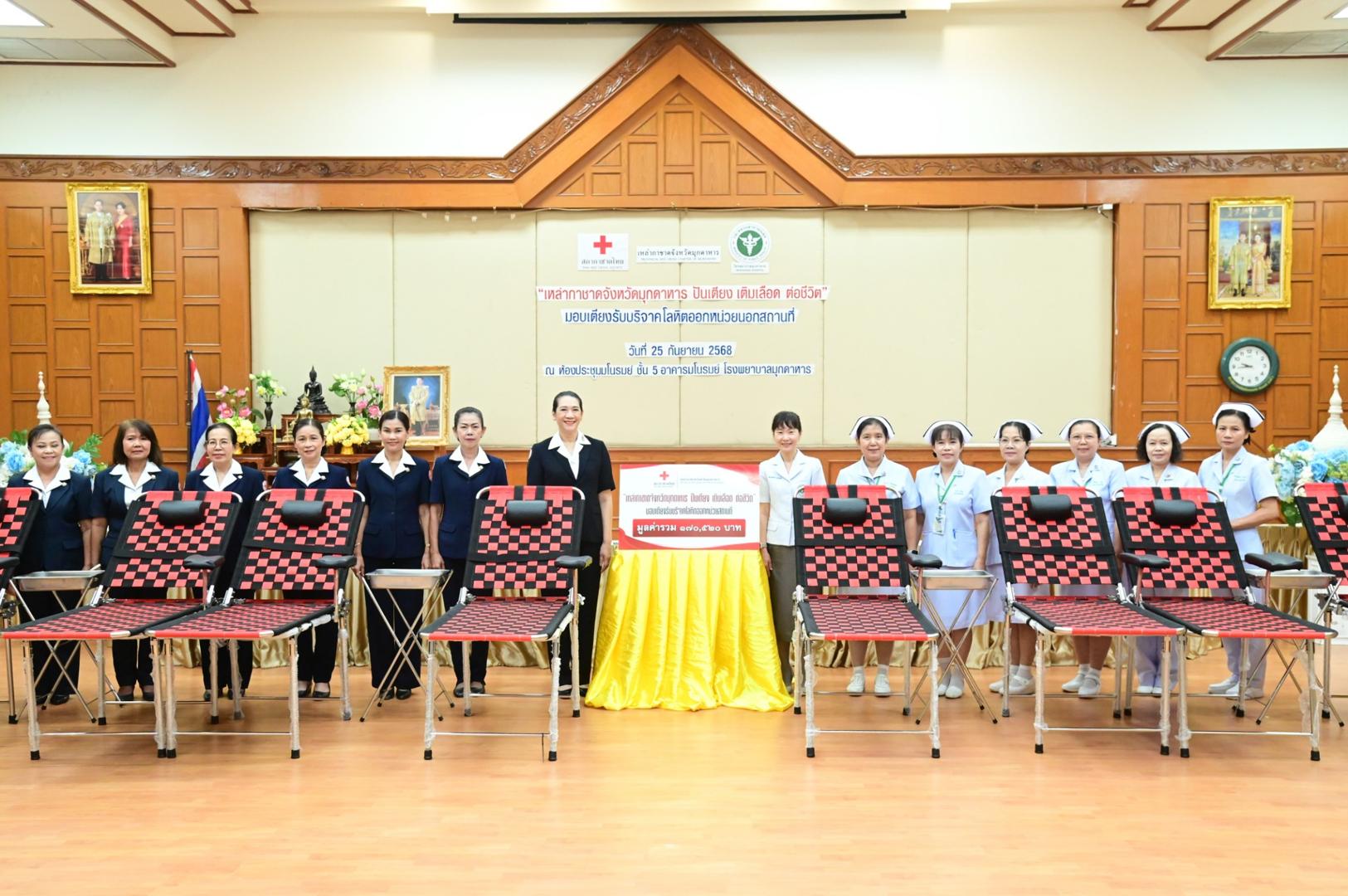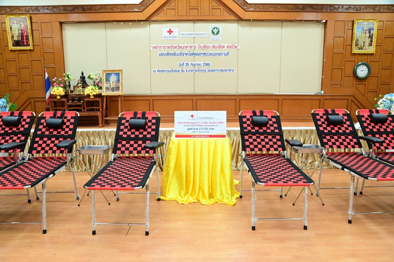 ทั้งนี้ โรงพยาบาลมุกดาหารได้รับมอบเตียงรับบริจาคโลหิตสำหรับใช้ออกหน่วยบริการเคลื่อนที่ จำนวน 6 ชุด มูลค่ารวมทั้งสิ้น 170,520 บาท (หนึ่งแสนเจ็ดหมื่นห้าร้อยยี่สิบบาทถ้วน) ซึ่งจะช่วยเพิ่มประสิทธิภาพการให้บริการประชาชนในพื้นที่ห่างไกล และส่งเสริมการมีส่วนร่วมในการบริจาคโลหิตเพื่อช่วยเหลือเพื่อนมนุษย์อย่างยั่งยืน