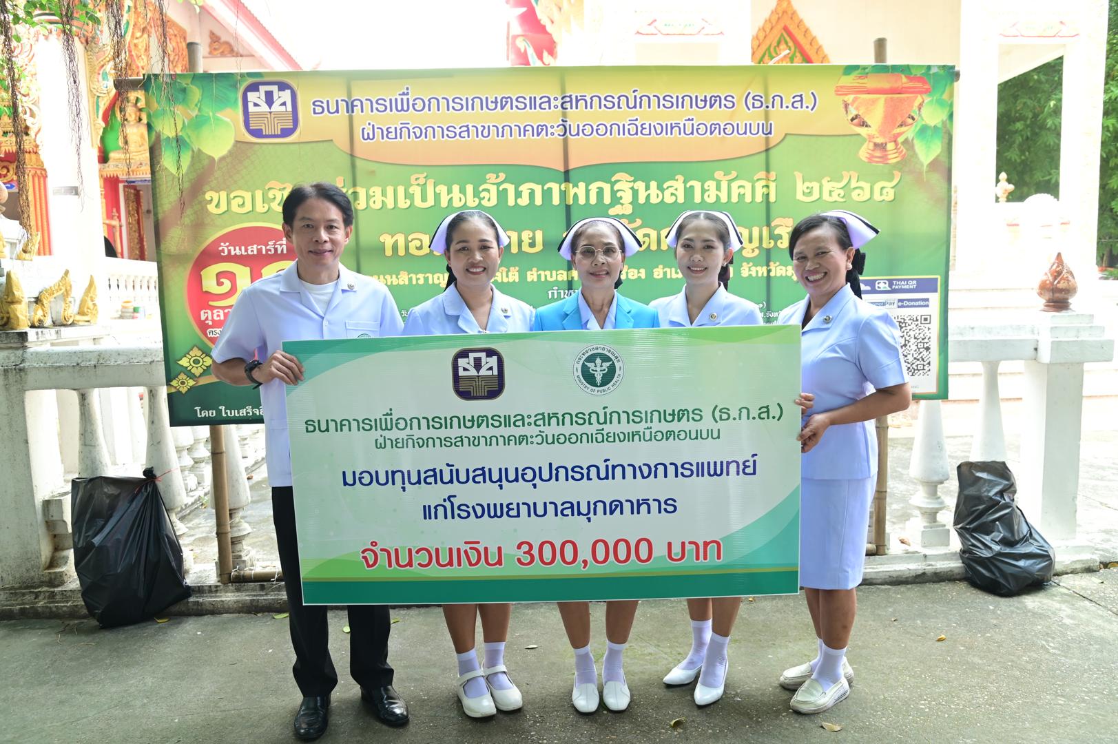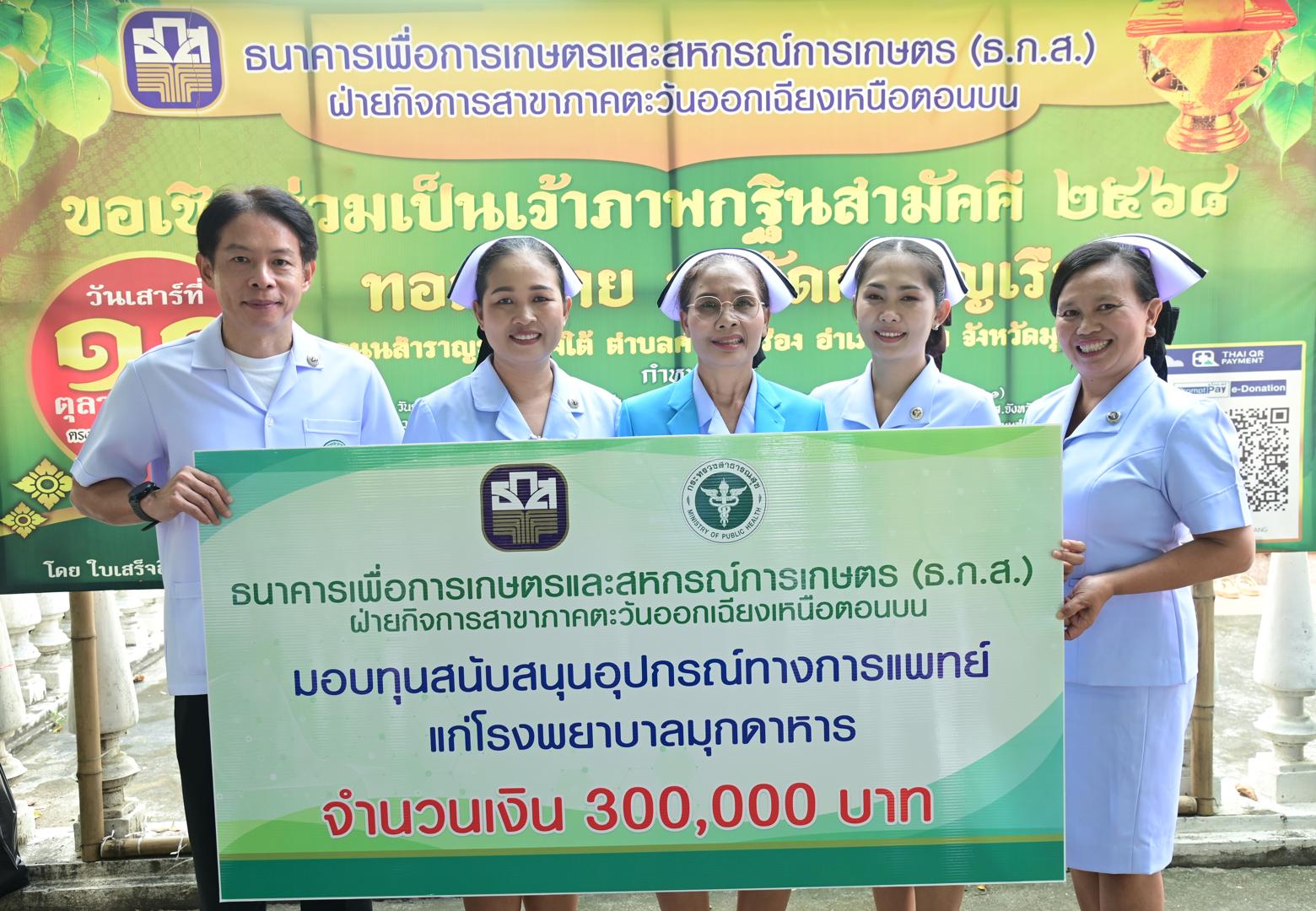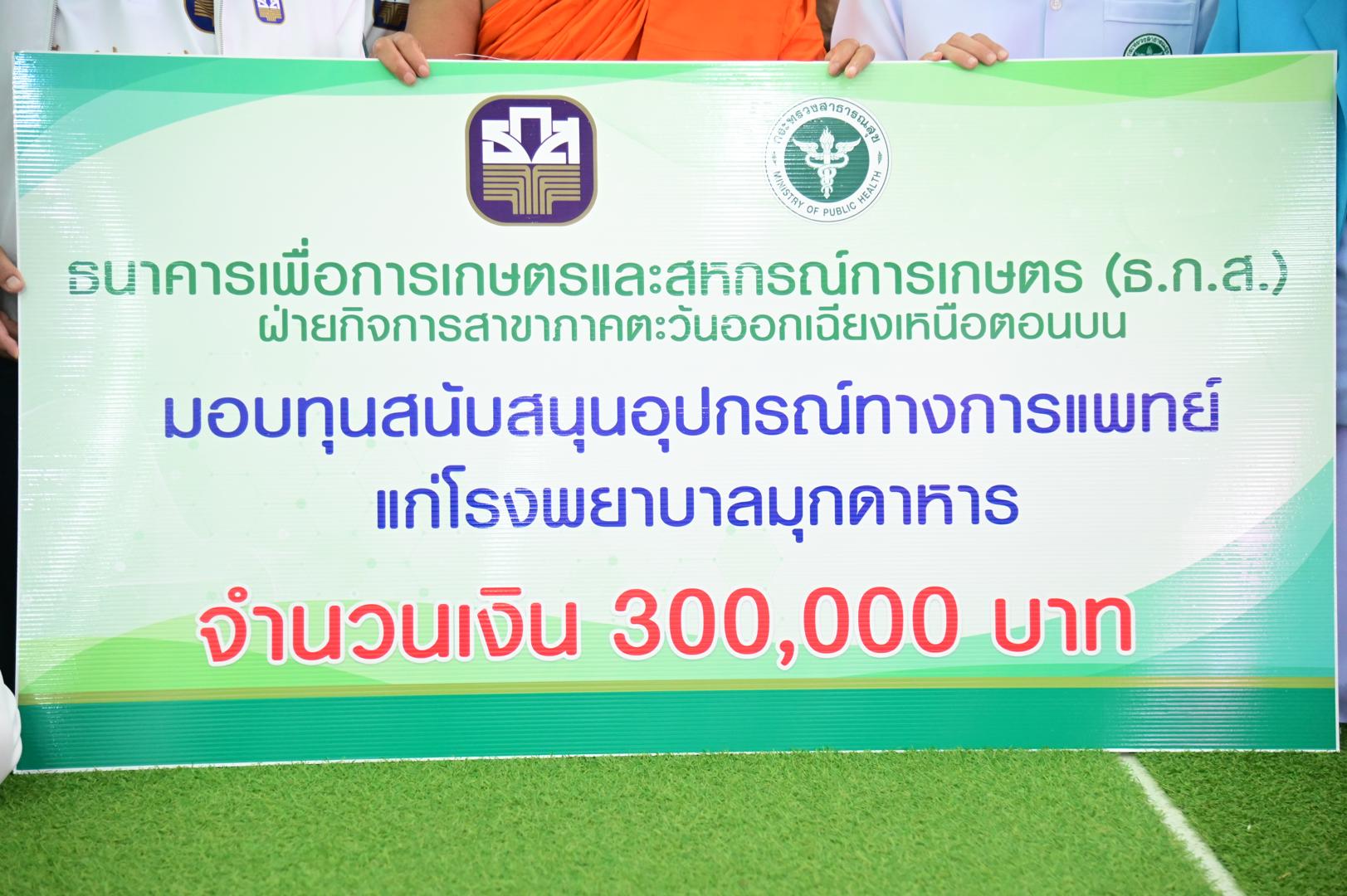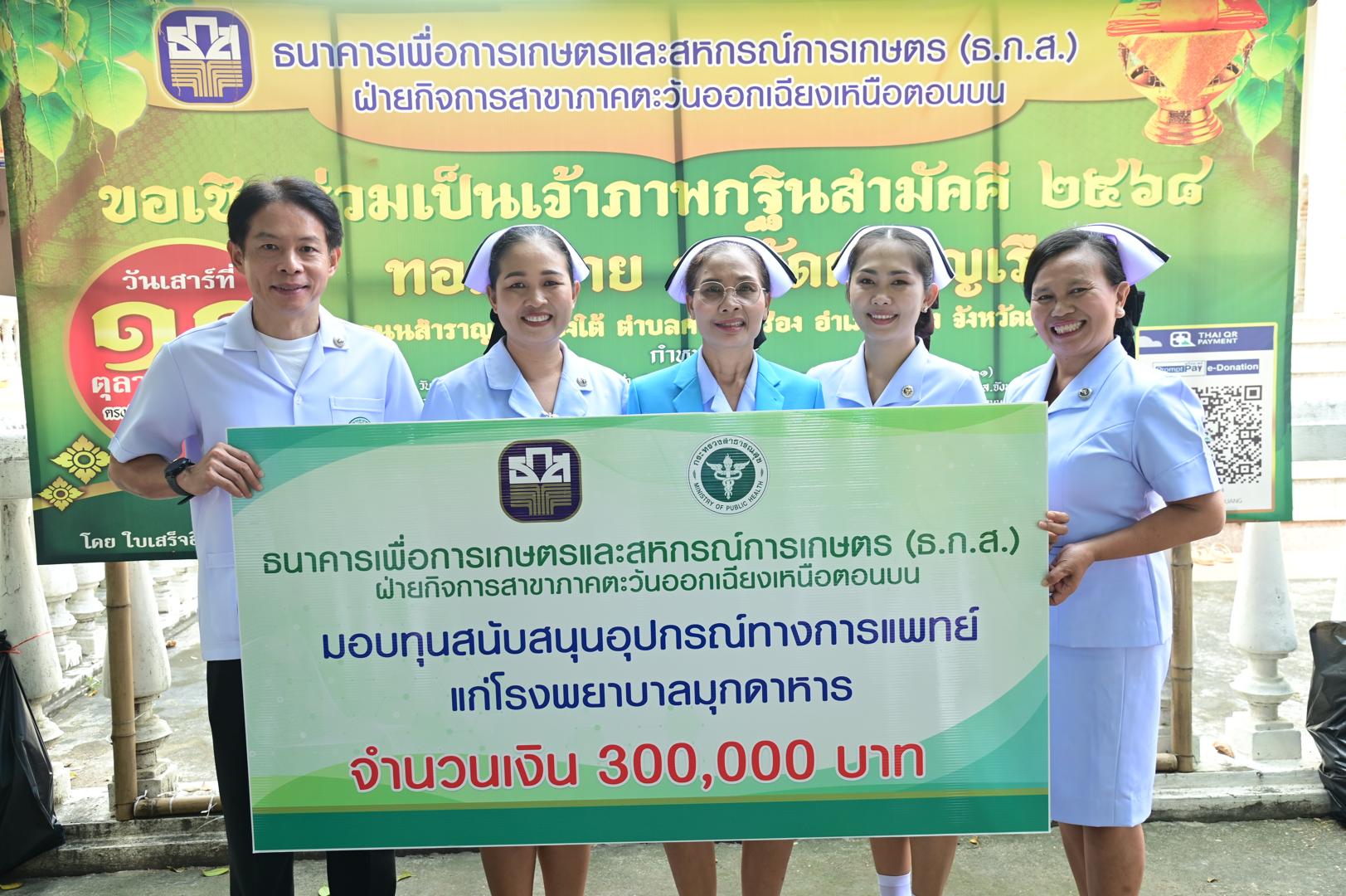แพทย์หญิงกันตินันท์ มหาสุวีระชัย ผู้อำนวยการโรงพยาบาลมุกดาหาร มอบหมายให้นางแสงไทย ไตรยวงค์ รักษาการในตำแหน่งผู้อำนวยการฝ่ายการพยาบาล และเจ้าหน้าที่โรงพยาบาลมุกดาหาร ร่วมเป็นเจ้าภาพทอดกฐินสามัคคี ธ.ก.ส.และรับมอบเงินสนับสนุนอุปกรณ์ทางการแพทย์(เครื่องกระตุกไฟฟ้าหัวใจ) จำนวน 300,000 บาท (สามแสนบาทถ้วน) เพื่อใช้ในการรักษาผู้ป่วยและเสริมสร้างคุณภาพบริการทางการแพทย์