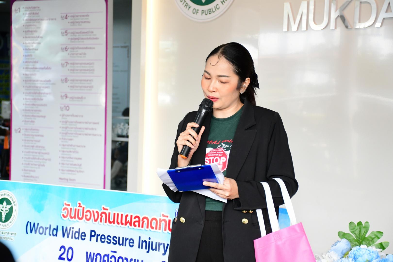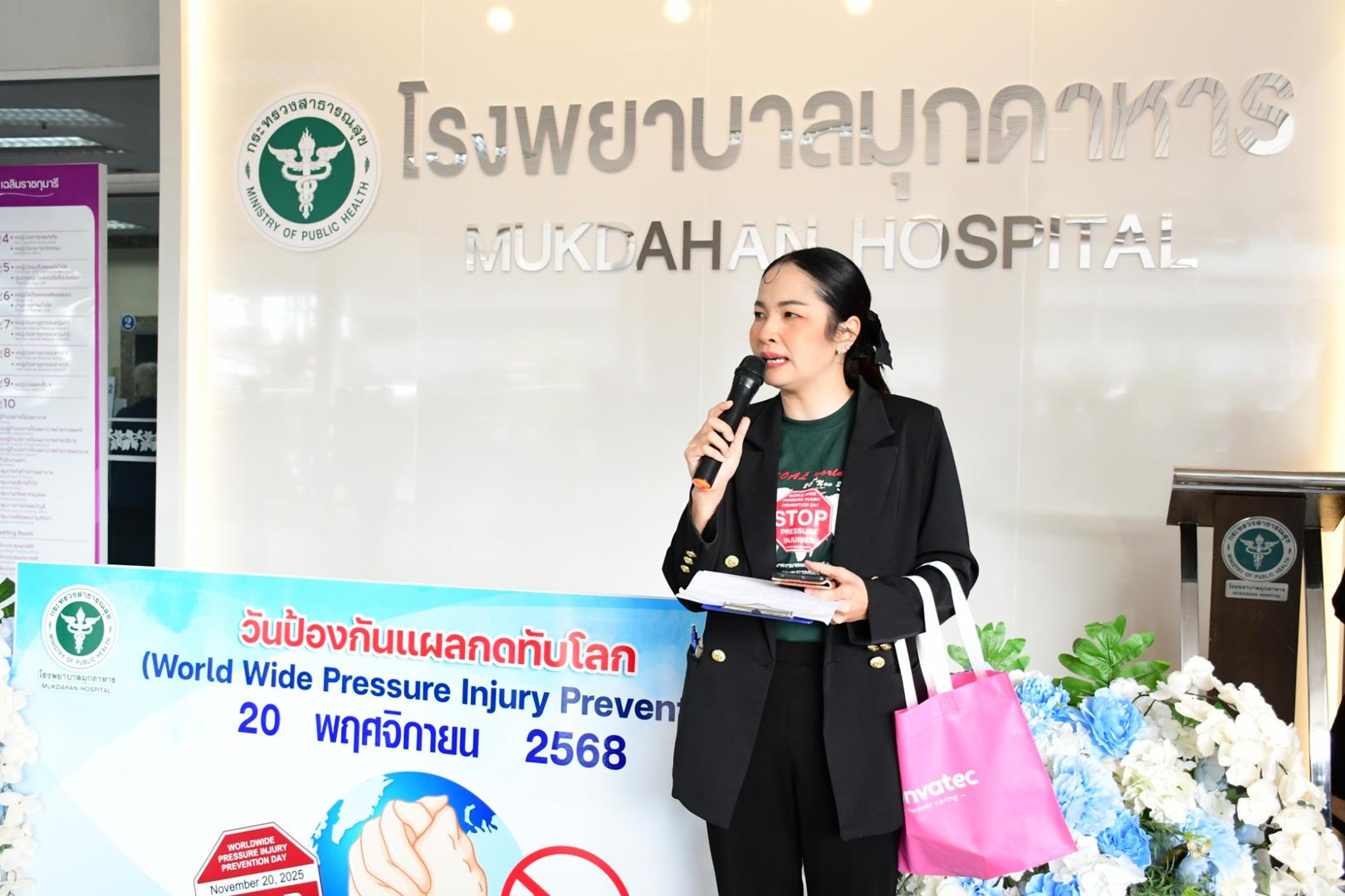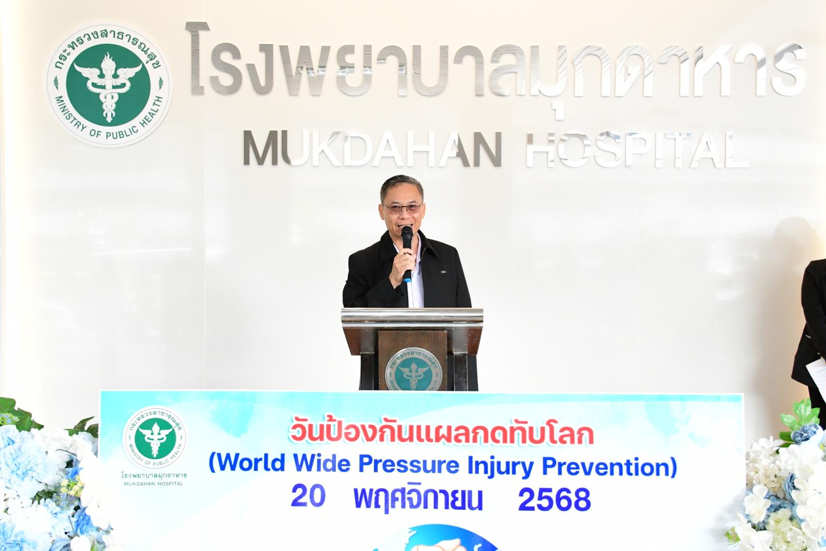 แพทย์หญิงนภาพร เกียรติดำรง ผู้อำนวยการโรงพยาบาลมุกดาหาร มอบหมายให้นายแพทย์วิลาศ นรินทร์ รองผู้อำนวยการฝ่ายการแพทย์ เป็นประธานเปิดกิจกรรม พร้อมด้วยนายแพทย์อนุชิต กุลวงษ์ หัวหน้ากลุ่มงานศัลยกรรม กล่าวรายงานในการจัดกิจกรรม วันรณรงค์ป้องกันแผลกดทับโลก (Worldwide Pressure Injury Prevention Day) ประจำปี 2568