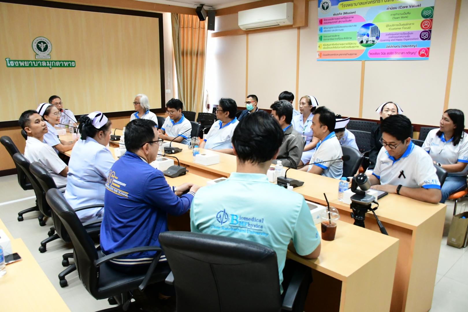 แพทย์หญิงนภาพร เกียรติดำรง ผู้อำนวยการโรงพยาบาลมุกดาหาร มอบหมายให้นายแพทย์วิลาศ นรินทร์ รองผู้อำนวยการฝ่ายการแพทย์ พร้อมด้วย พว.แสงไทย ไตรยวงค์ รองผู้อำนวยการฝ่ายการพยาบาล ให้การต้อนรับคณะศึกษาดูงานจากคณะวิทยาศาสตร์ และวิทยาลัยแพทยศาสตร์และการสาธารณสุข มหาวิทยาลัยอุบลราชธานี ในการดูงานเครื่องมือแพทย์และร่วมปรึกษาแนวทางความร่วมมือทางด้านการเรียนการสอนหลักสูตรฟิสิกส์ชีวการแพทย์ โดยให้นักศึกษามีความรู้ และทักษะในการทำงานที่เกี่ยวข้องกับอุปกรณ์และเครื่องมือทางการแพทย์ สามารถใช้งานซ่อมบำรุง ดัดแปลง พัฒนาเทคโนโลยี ทำนวัตกรรมสอบเทียบ และบริหารจัดการอุปกรณ์และเครื่องมือทางการแพทย์ได้ถูกต้องตามหลักความปลอดภัยและกฎระเบียบมาตรฐานสากล
