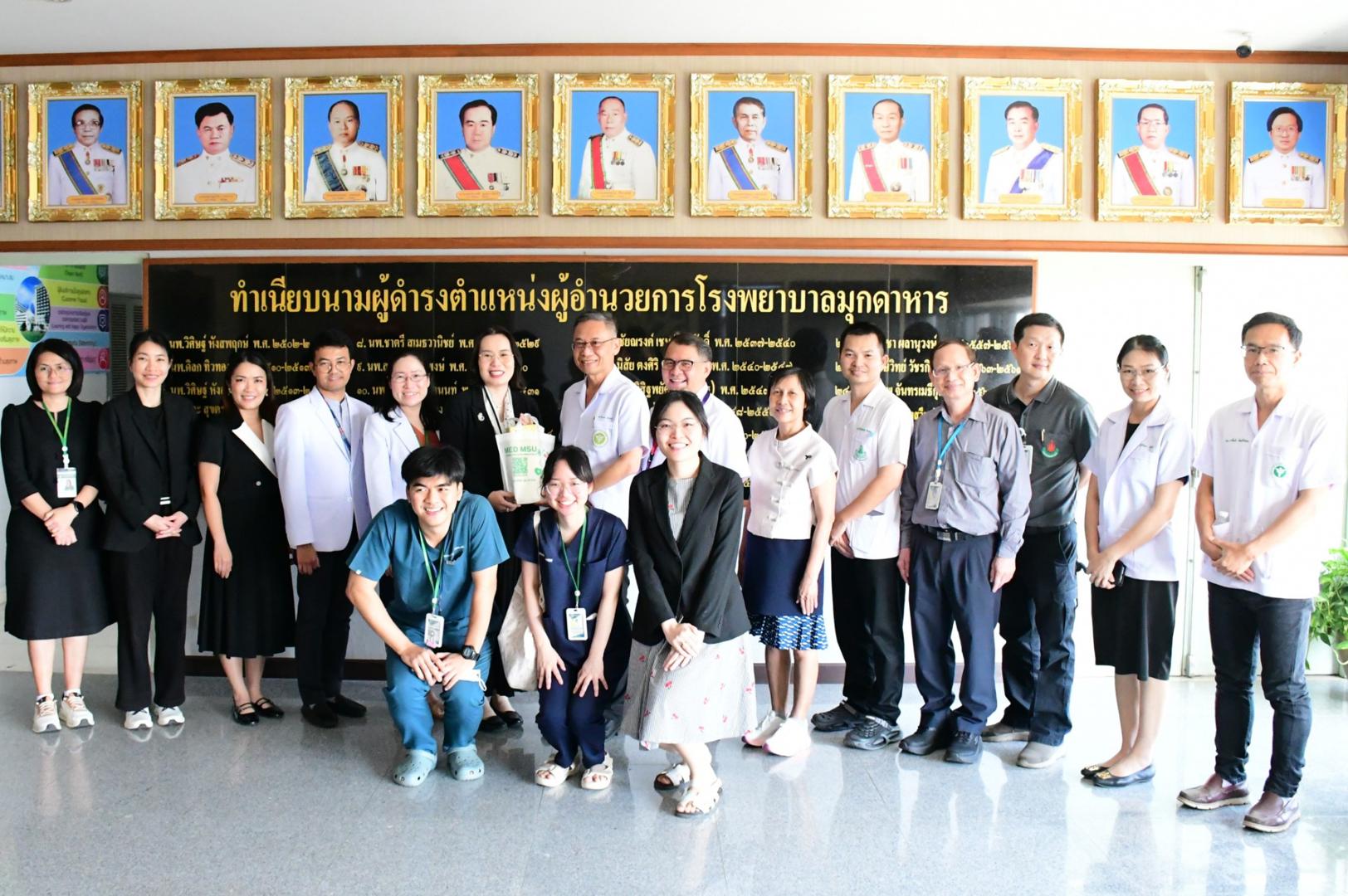 แพทย์หญิงนภาพร เกียรติดำรง ผู้อำนวยการโรงพยาบาลมุกดาหาร มอบหมายให้นายแพทย์วิลาศ นรินทร์ รองผู้อำนวยการฝ่ายการแพทย์ พร้อมด้วยคณะผู้บริหารและเจ้าหน้าที่ ร่วมให้การต้อนรับและแลกเปลี่ยนข้อมูลการปฏิบัติงานของบัณฑิตแพทย์ที่ปฏิบัติงานในพื้นที่ เพื่อติดตามผลการปฏิบัติงาน รับฟังปัญหาและอุปสรรค ตลอดจนข้อเสนอแนะในการพัฒนาศักยภาพบัณฑิตให้สอดคล้องกับบริบทการให้บริการทางการแพทย์ในพื้นที่