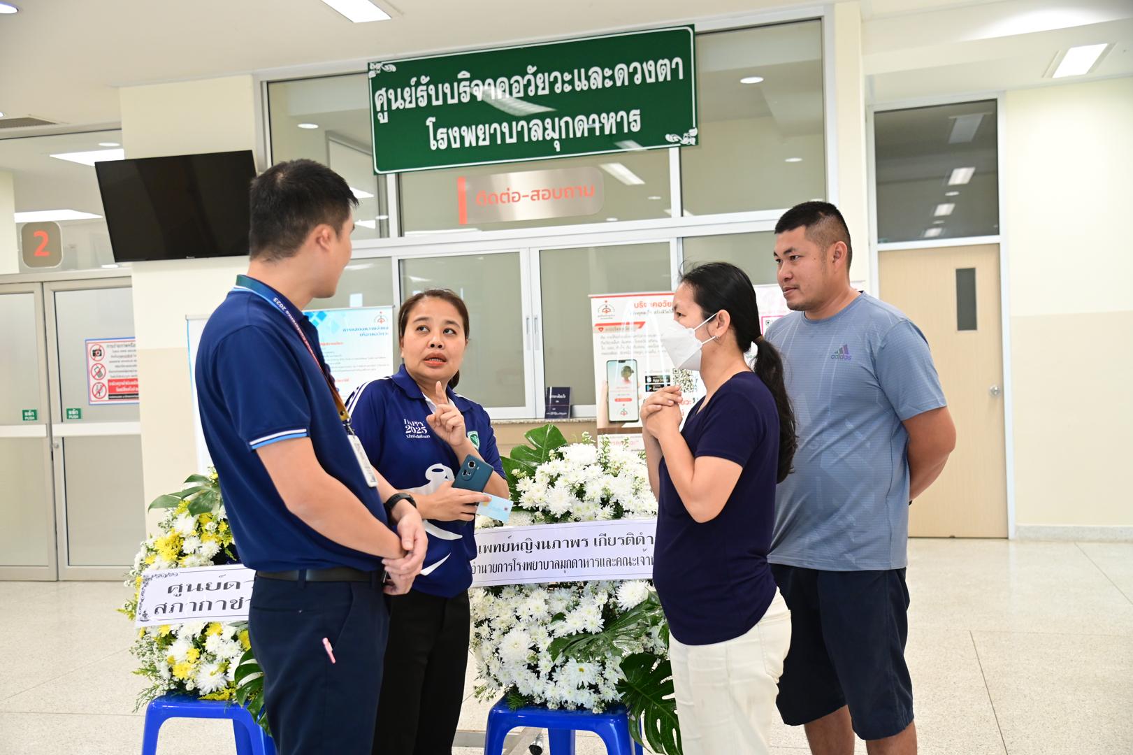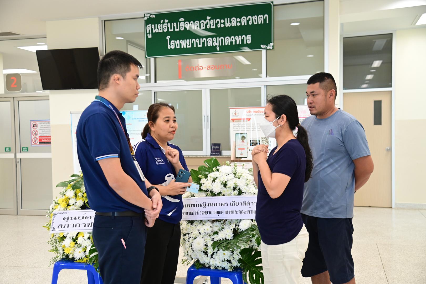 แพทย์หญิงนภาพร เกียรติดำรง ผู้อำนวยการโรงพยาบาลมุกดาหาร มอบหมายให้นายแพทย์วิลาศ นรินทร์ รองผู้อำนวยการฝ่ายการแพทย์ พร้อมด้วยคณะแพทย์ พยาบาล และบุคลากรศูนย์รับบริจาคอวัยวะ โรงพยาบาลมุกดาหาร ร่วมกับเหล่ากาชาดจังหวัดมุกดาหาร มอบพวงหรีดจากสภากาชาดไทยและโรงพยาบาลมุกดาหาร