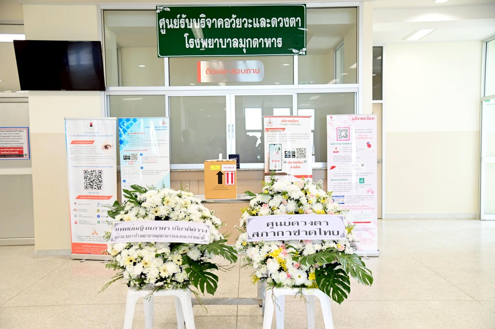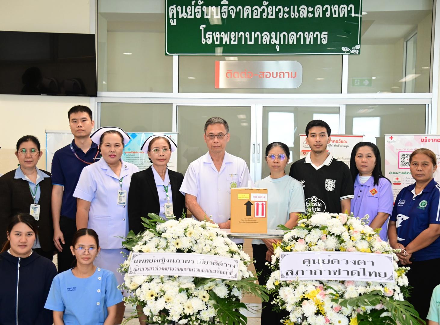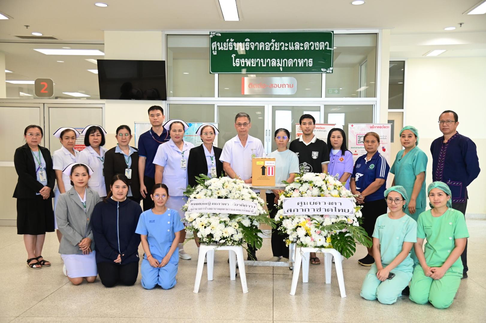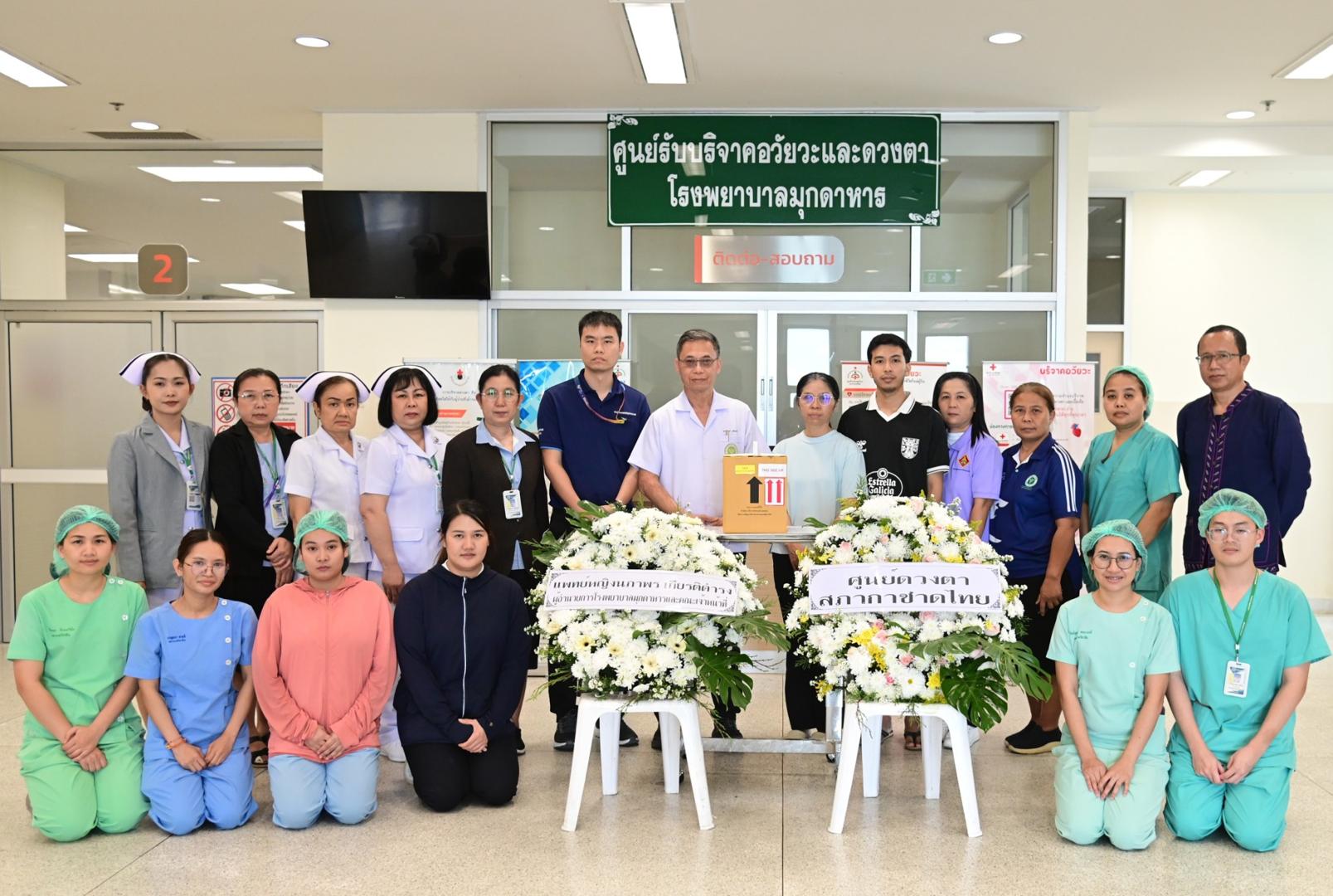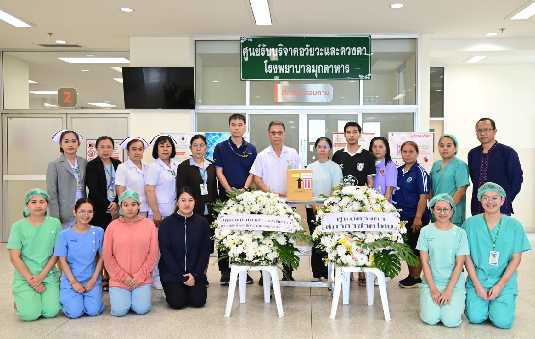 แพทย์หญิงนภาพร เกียรติดำรง ผู้อำนวยการโรงพยาบาลมุกดาหาร มอบหมายให้นายแพทย์วิลาศ นรินทร์ รองผู้อำนวยการฝ่ายการแพทย์ พร้อมด้วยคณะแพทย์ พยาบาล และบุคลากรศูนย์รับบริจาคอวัยวะ โรงพยาบาลมุกดาหาร ร่วมกับเหล่ากาชาดจังหวัดมุกดาหาร มอบพวงหรีดจากสภากาชาดไทยและโรงพยาบาลมุกดาหาร