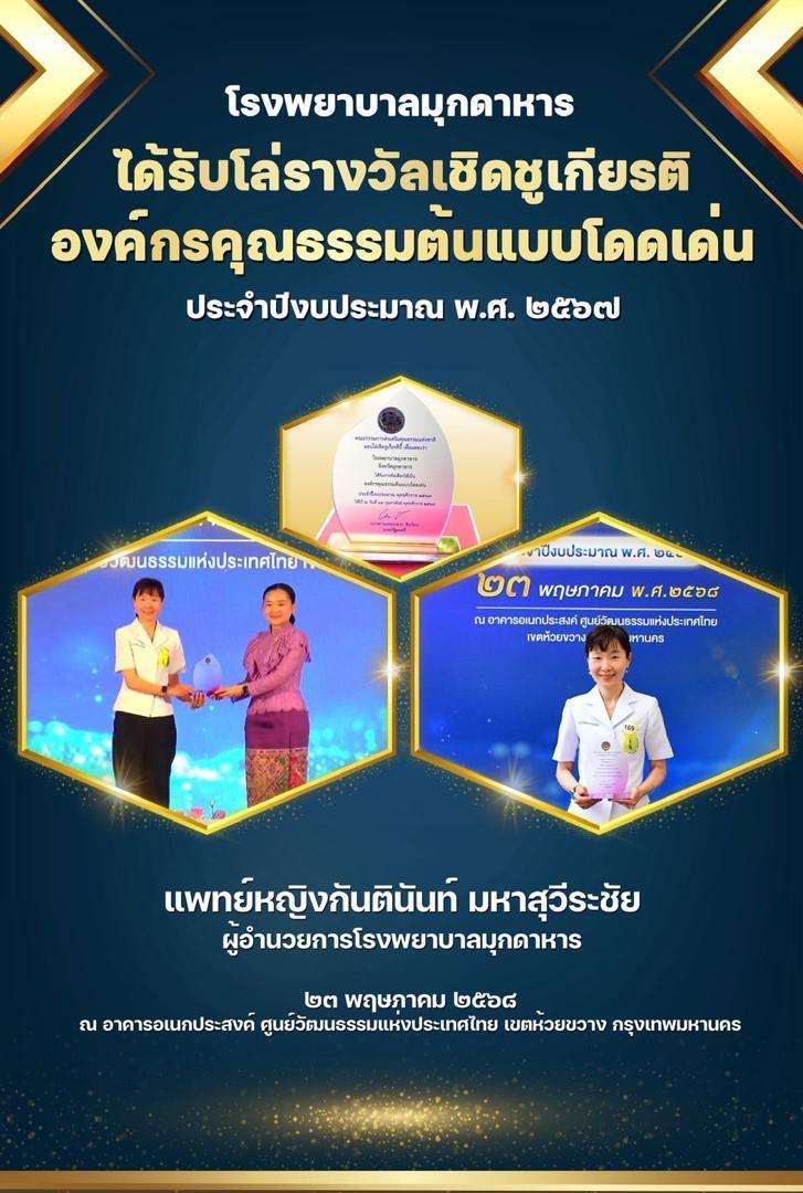 โรงพยาบาลมุกดาหารได้รับโล่รางวัลเชิดชูเกียรติองค์กรคุณธรรมต้นแบบโดดเด่น ประจำปีงบประมาณ พ.ศ.2567